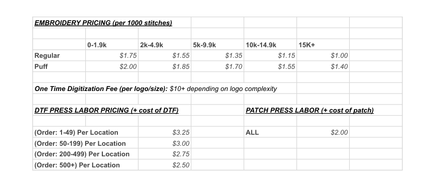 - Embroidery (Hats, Clothing, Luggage, etc.) 10 item minimum